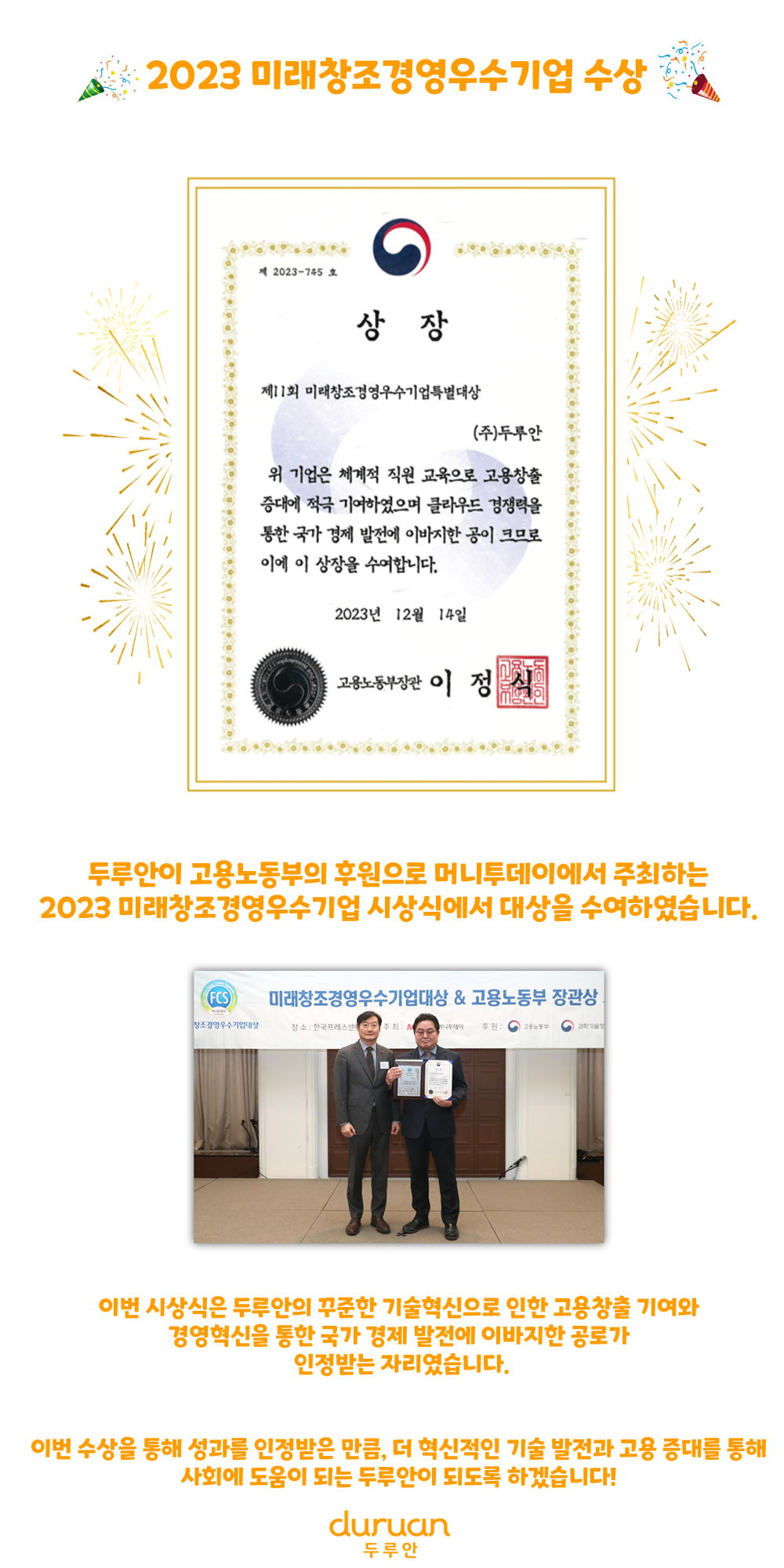(주)두루안 미래창조경영우수기업 수상