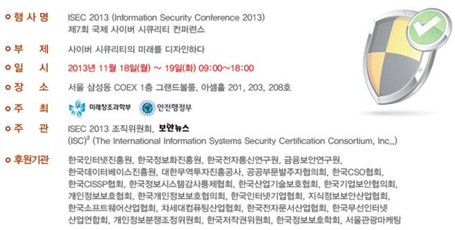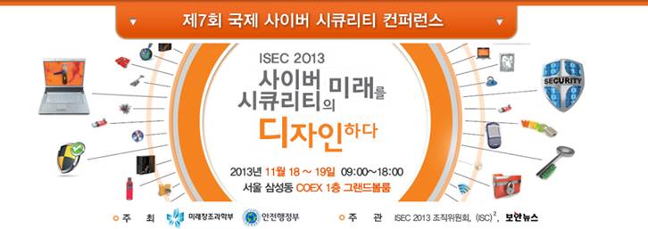 2013년 11월 18일 ~ 19일 서울 삼성동 COEX에서 제7회 국제 사이버 시큐리티 컨퍼런스 행사가 진행 됩니다.