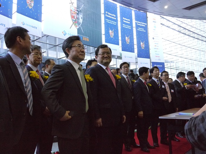 <첫번째줄 왼쪽두번째부터 국가보안기술연구소 김광호 소장, 미래창조과학부 최재유 차관, 대검찰청 김오수 과학수사부장 >
