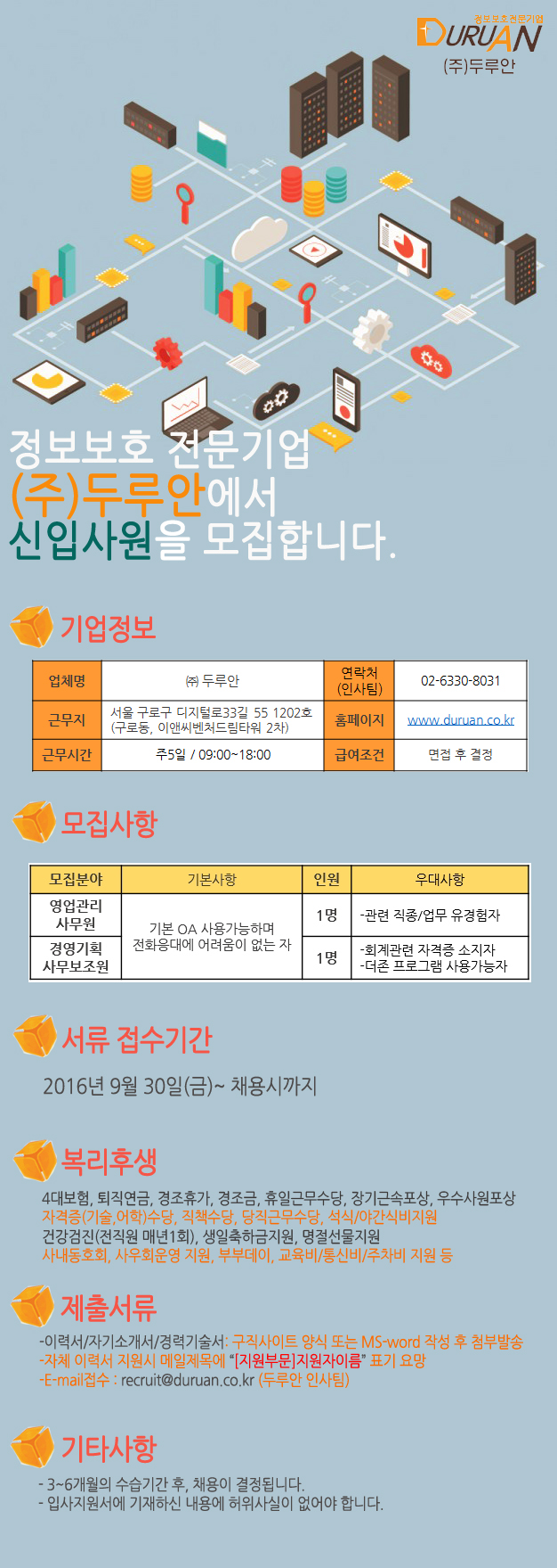 [채용공고] (주)두루안에서 영업관리 사무원 및 경영기획팀 사무보조원을 모집합니다. (신입)