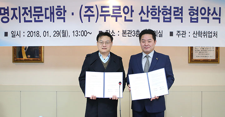 최근 명지전문대학에서 열린 산합협력 체결식에서 명지전문대학과 두루안은 자원을 공동으로 활용해 상호 이익 증진에 협력하기로 했다.